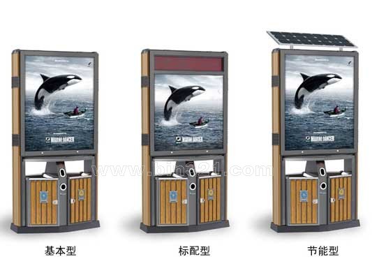 型号:A7203 规格:L1170*W420*H2160mm 材质:果皮箱框架、箱体及主箱体均采用电解镀锌钢板为基材,果皮箱顶盖采用优质电解镀锌板整体拉伸成型的工艺制作,顶盖底沿口采用内翻边成型工艺。果皮箱箱体采用优质电解镀锌板,分解压制成型,桶身面板处压制加强筋,为提高产品稳定性箱体上沿采用钢材包边。框架两侧装饰为铝合金型材,底座为高强工业塑料注塑成型,外形美观、防腐、扎实耐用。果皮箱整体采用户外塑粉静电喷涂,上盖、箱体和窗盖为深灰,两侧框架为灰黑色,框架装饰型材为柚木色。装饰木条为纤维塑胶木,户外长期使用能够不变形、不退色、不开裂;垃圾投放内桶采用镀锌板制作。广告位采用超白钢化玻璃画窗,坚固耐用,永不变色。加强型整体框架设计,结构稳定,安全可靠,门框采用防水结构,立柱侧面配有透气散热装置,能够更好地保护内部电器元件提高使用寿命。