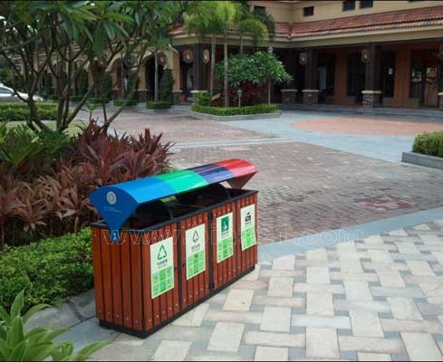 型号:A2013 规格:L1560*W430*H950mm 材质:钢木分类垃圾桶。垃圾桶采用钢架结构,表面经过酸洗、去锈、然后采用户外粉末静电喷涂处理。桶身为马来西亚进口山樟木条装饰,表面采用户外聚酯漆或户外水封漆上色涂装。垃圾桶内胆采用镀锌板材质。