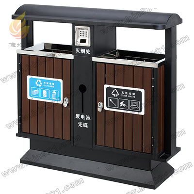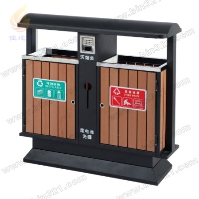材质:钢木分类垃圾桶。垃圾桶采用钢架结构,表面经过酸洗、去锈、然后采用户外粉末静电喷涂处理。桶身为环保塑木木条装饰 ,垃圾桶内胆采用镀锌板材质。 塑木颜色:柚木色,咖啡色