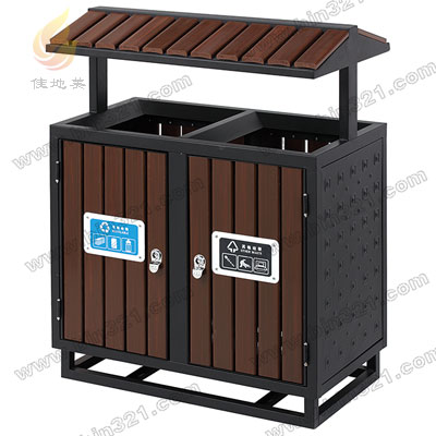 材质:钢木分类垃圾桶。垃圾桶采用钢架结构,表面经过酸洗、去锈、然后采用户外粉末静电喷涂处理。桶身为环保塑木条装饰,内胆采用镀锌板材质。
