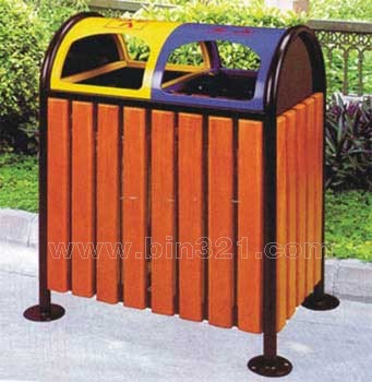 型号:A2310 规格:L690*W430*H900mm 材质:钢木分类垃圾桶。垃圾桶采用钢架结构,表面经过酸洗、去锈、然后采用户外粉末静电喷涂处理。桶身为实木木条装饰,表面采用户外聚酯漆或户外水封漆上色涂装。内胆采用镀锌板材质。