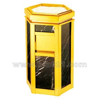 材质:垃圾桶采用优质不锈钢材质模具制做,金色部份为不锈钢镀钛。黑色部份为天然大理石饰面,上盖带有烟灰盅,镀锌板内胆。
