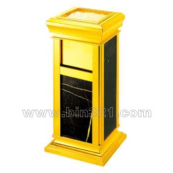 材质:垃圾桶采用优质不锈钢材质模具制做,金色部份为不锈钢镀钛。黑色部份为天然大理石饰面,上盖带有烟灰盅,镀锌板内胆。