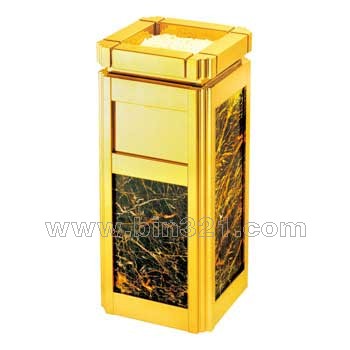 材质:大理石垃圾桶。垃圾桶采用优质不锈钢材质模具制做,金色部份为不锈钢镀钛。黑色部份为天然大理石饰面,上盖带有烟灰盅,镀锌板内胆。