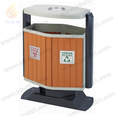 材质:钢架结构,表面经过酸洗、去锈、然后采用户外粉末静电喷涂处理。桶盖为整体拉伸成型,桶身为环保塑木木条装饰,垃圾桶内胆采用镀锌板材质。