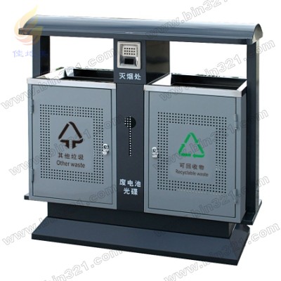 型号:A3327-B 规格:L1000×W360×H1000mm 材质:垃圾桶采用优质电解钢板材质,表面经过酸洗、去锈、然后采用户外粉末静电喷涂处理。完全能适应室外各种恶劣环境,耐腐蚀,不易褪色,使用年限长。垃圾桶内胆采用镀锌板材质。
